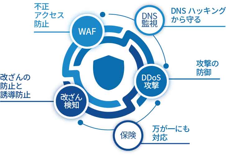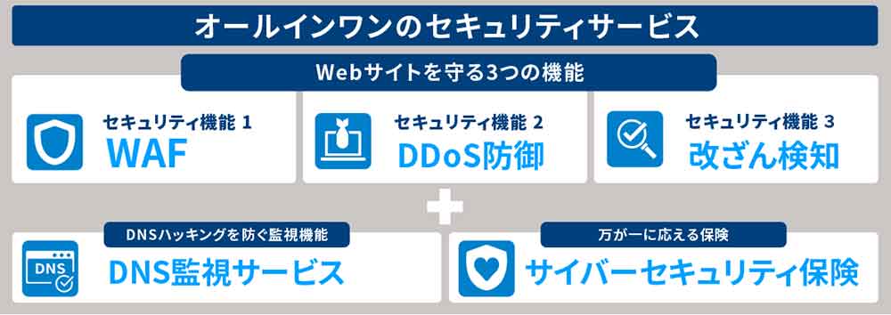 WAFだけでは守りきれないWebサイトへのサイバー攻撃を、WAF、DDos攻撃からの防御、改ざん検知、DNS監視、サイバーセキュリティ保険のオールインワン「多層防御」で提供します。